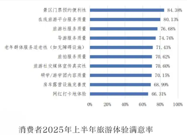 调查也暴露了行业问题,网红打卡地与新兴业态体验未达预期,其中,消费者对网红打卡地、房车露营设施满意率分别为66.31%、68.99%,网络口碑大数据调查表明,主要原因为过度商业化、环境脏乱、实物与宣传差距大等;研学游学、旅拍服务满意率约为70%,前者面临资质混乱、安全隐患等问题,后者则有隐性收费、售后无响应等困扰。