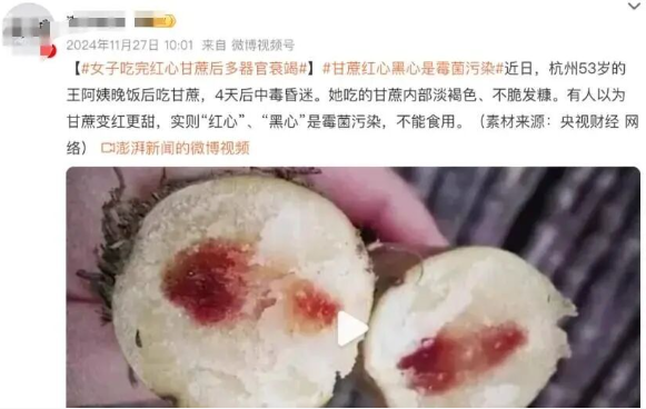 很多人误以为红心甘蔗是含糖量高的表现,其实这是甘蔗霉变的危险信号。