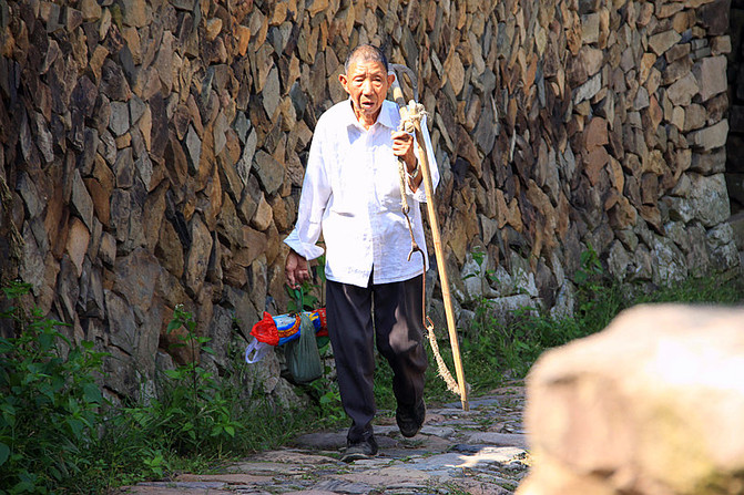 除了三三两两的游客和拍客,村里住民并不多。从我的感觉来看,游客和拍客甚至要超过住民的人数。偶尔看到的原住民,绝大多数是苍颜白发的老叟,或在卵石路上缓行,或斜倚在藤椅上看云舒云卷、日升日落。村里的年轻人大都搬出去了,也或者辞别故土前往大中小城市打工谋生去了,留下的这个村落就交给了安土重迁、与世无争的老人们来看守。