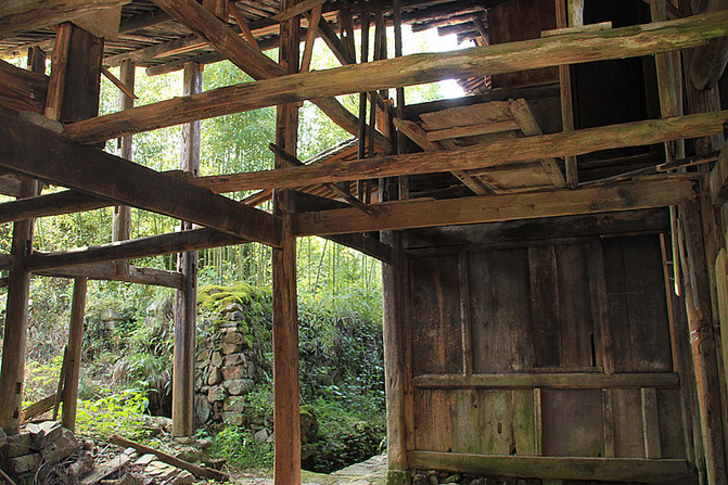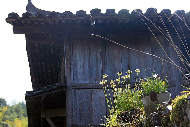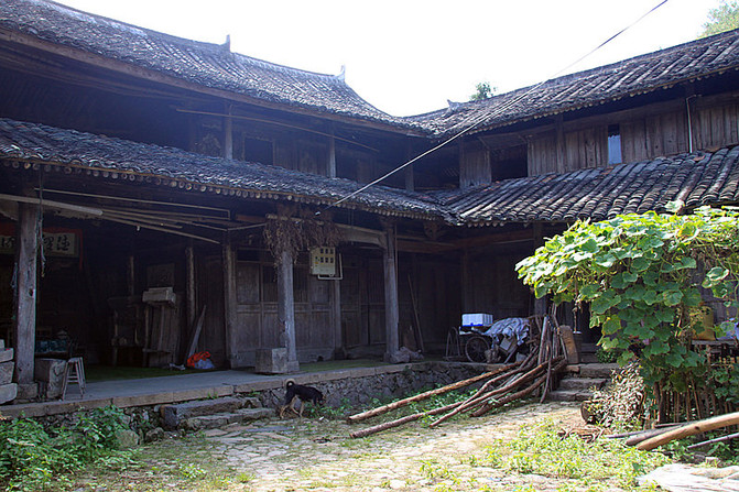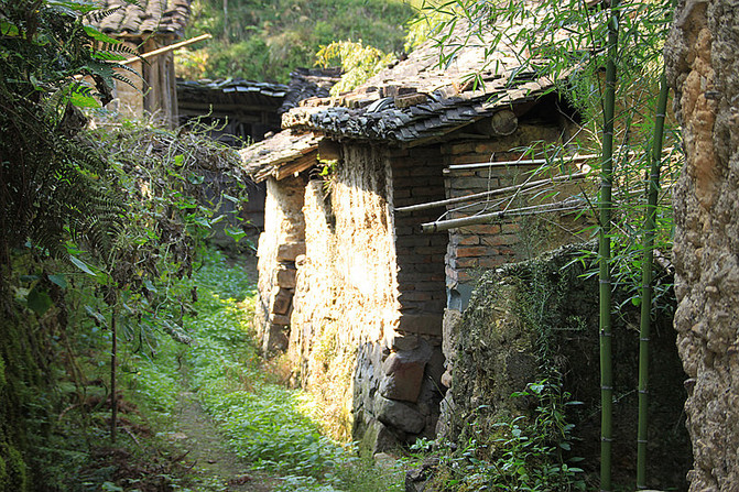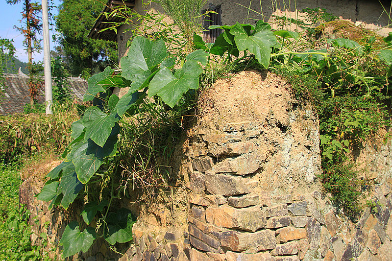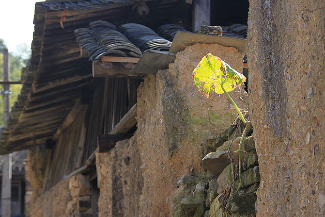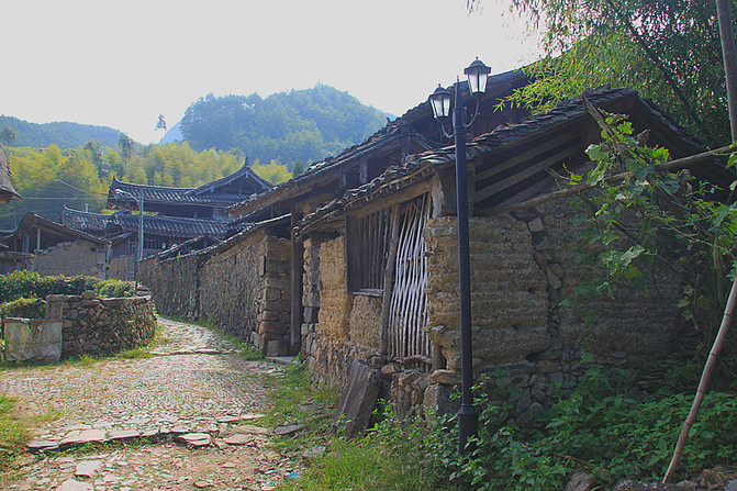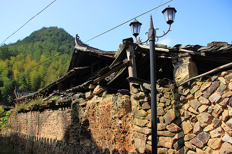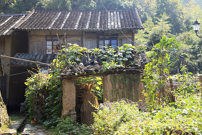 或许由于年久失修,村落里不少老屋已经歪歪扭扭,留下些断垣残壁,长着些藤蔓瓜果。鸡犬之声相闻,方才给这个古村落带来些生动。但说它年久失修,似乎又不全对,偶尔有那么几盏路灯杵在那里,竟然是英伦式的。中国浙南古村落,夹着些英伦范儿,倒也增添了些混搭的趣味。