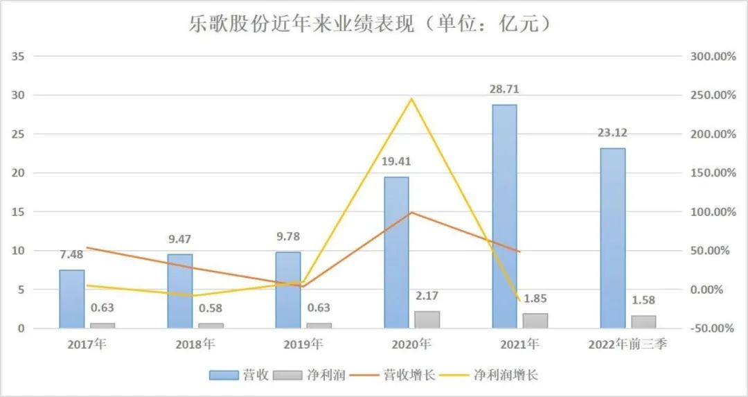 上市后,乐歌股份的业绩波动上升。2017年至2021年,乐歌股份营收分别为7.48亿元、9.47亿元、9.78亿元、19.41亿元、28.71亿元,净利润则从2017年的0.63亿元波动上涨至2021年的1.85亿元。