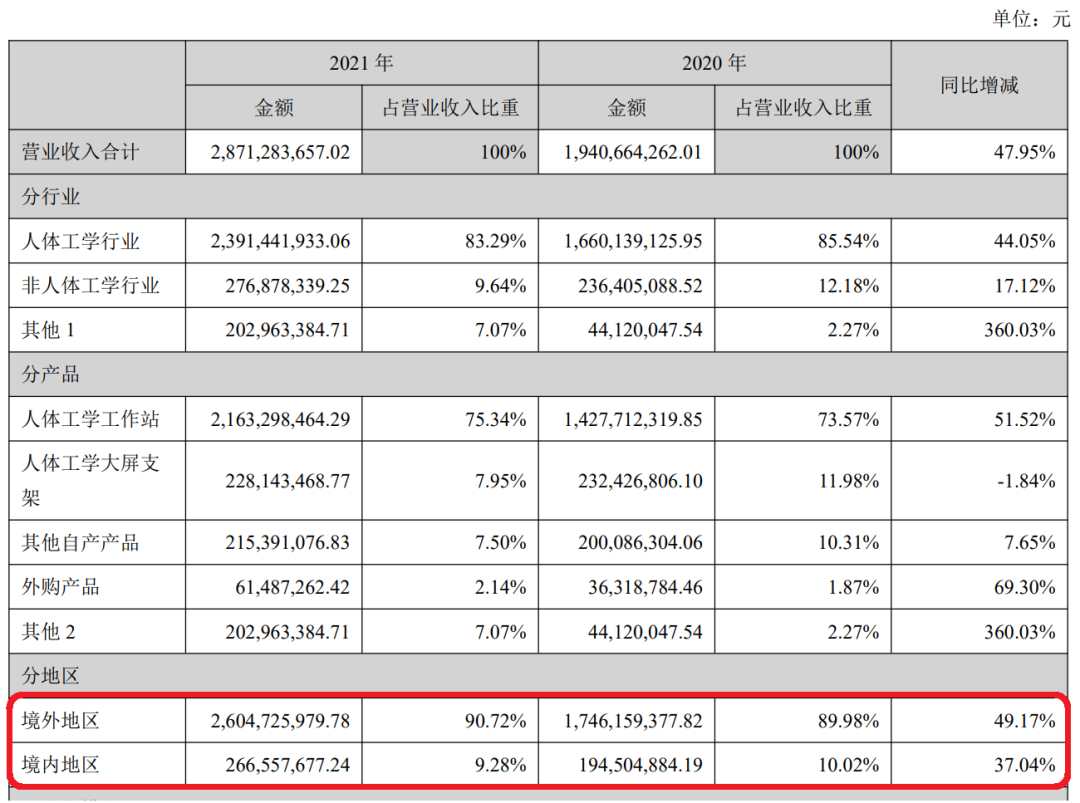 据了解,乐歌股份在国内主打“乐歌”品牌,而在国外则主打“flexispot”品牌,并积累了12年跨境电商、10年海外仓的运营经验。2021年,公司境外营收占比高达90.72%。