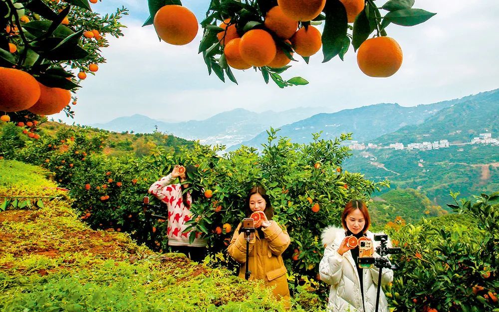 ▲ 2020年12月4日,湖北秭归的电商主播在郭家坝镇擂鼓台村的生态柑橘园直播推介红肉脐橙 王罡摄