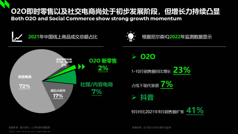 尼尔森IQ报告显示,中国快消品全渠道增长在过去一年面临挑战,线上线下增速趋同。O2O即时零售及直播电商尚处于初步发展阶段,但增长力持续凸显。在2021年中国线上商品成交总额中,O2O新零售占比仅为2%,但在2022年的 1月至10月销售额同比增长23%,占线下现代渠道总销量的7%。