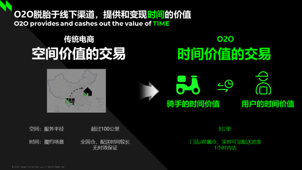 不同于传统电商的空间价值交易,O2O脱胎于线下渠道,提供和变现时间的价值,满足消费者应急型、即时、新兴的消费需求。同时,O2O对于传统线上线下渠道,扮演了增量、溢价和提效的角色。尼尔森IQ数据显示,消费者在工作日通过O2O和大卖场购买生鲜的时间比例分别为65%和28%,形成O2O与传统渠道的有效互补。O2O线上订单平均履约时间为2小时,赋能扩大门店辐射范围,是供应链提升的推进器。