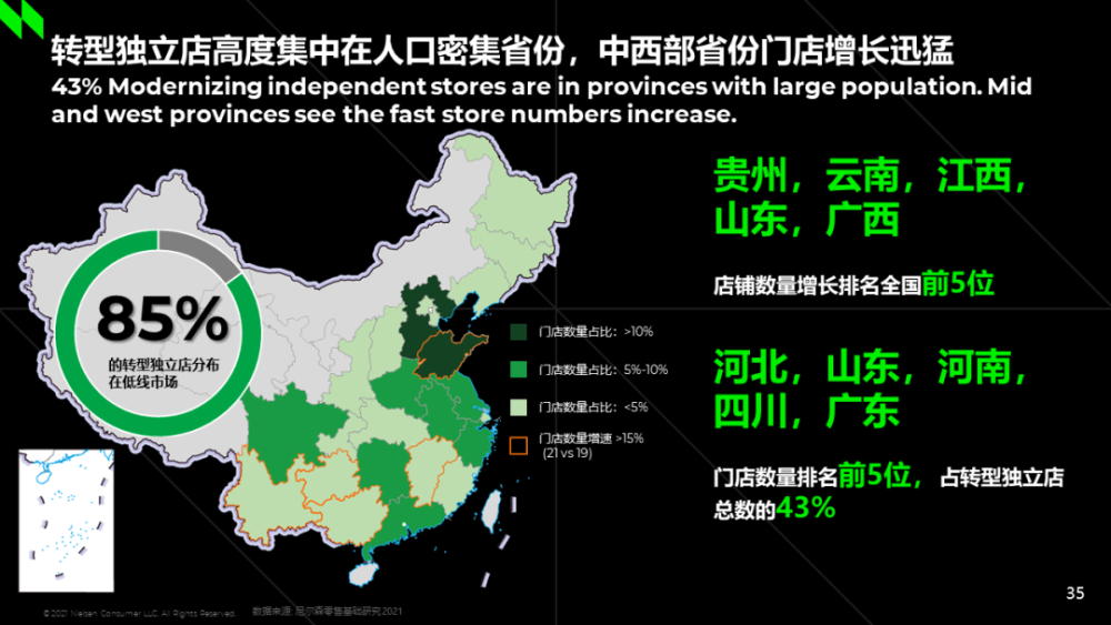 增长的机会不仅存在于创新、提价策略,老品通过合理的渠道布局增效也是非常重要的主题。尼尔森IQ数据显示,未来五年,两个线下销售通路会帮助品牌商带来更快的增长。一个是现代连锁店,包含大型超市、连锁超市及便利店,与2019年相比在2021年的涨幅分别为14.3%、22.3%及0.2%。另一个是现代化转型的非连锁独立店,包含非连锁小型超市及大型食杂店,2021年非连锁大型食杂店数量为111万家,较2019年增长8%。从其在全国地域的发展来看,重点集中在沿海及人口密集省份,中西部省份增长速度迅猛。其中,贵州、云南、江西、山东、广西店铺数量增长最快,位列全国前5位。河北、山东、河南、四川、广东门店数量排名前5,占转型独立店总数的43%。