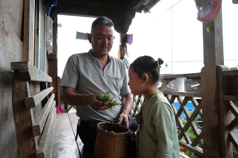 采茶归来的向嘎在和外孙女玩耍(2022年6月10日摄)。新华社记者 刘颍 摄