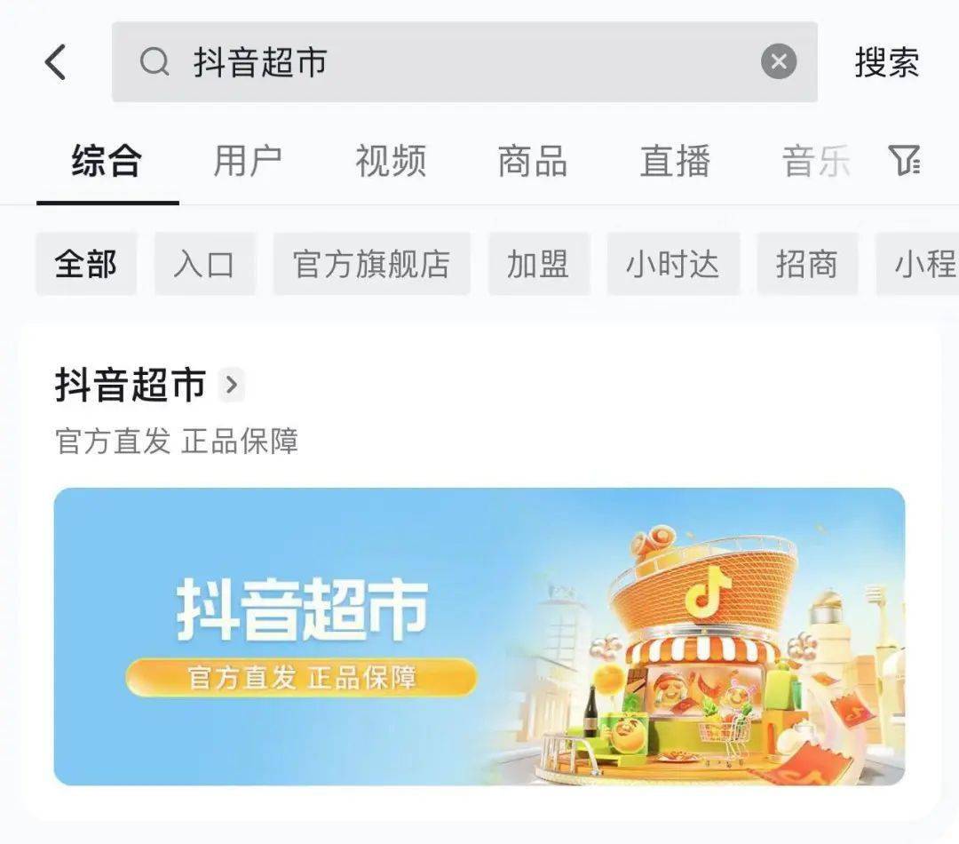 目前在抖音搜索“抖音超市”,会显示“抖音电商超市”入口,点击该入口后可进入超市频道。