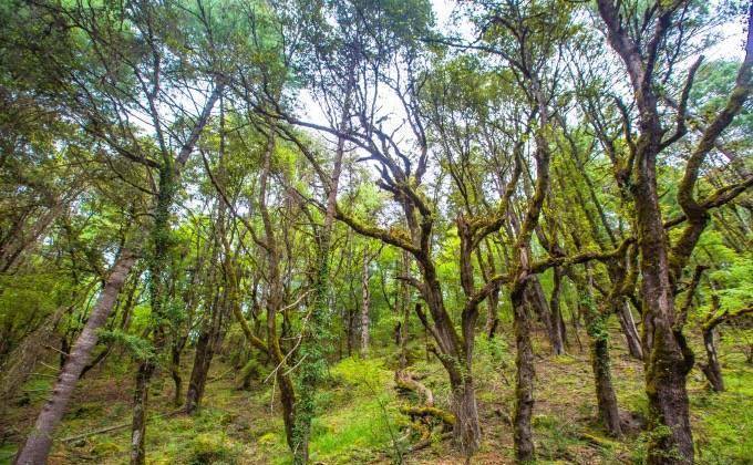 墨绿色的高山松树蜿蜒曲折,仿佛迷失在深处。
