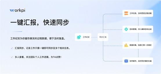 workpi秉持让工作汇报更简单便捷的理念,支持多项任务一键同步汇报,对个人日常工作及关键成果进行记录总结,支持多人查看,实现组织经营互联互通。管理者还可以及时关注团队成员的个人工作进展,领导者可以随时随地掌握公司动态。