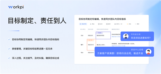 workpi通过组织目标协同制定,快速同步团队内部目标指标;通过表格管理,对关键目标和工作结果进展直观展示。管理者可以深入了解各项任务过程,关注细节以便进行及时纠偏,确保组织目标达成。