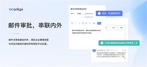 workpi通过邮件式审批联动内外,满足企业管理流程中涉及内部或外部的所有审批节点处理。支持多种文件格式,多人协作,审批涵盖形式广,审批节点自由覆盖,过程记录,好追溯。