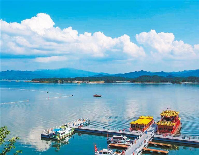 6月26日,位于安徽省舒城县万佛湖镇白鹿村的国家5A级景区万佛湖,朵朵白云点缀在蔚蓝色的天空上,与湖面景观交相辉映,让人心旷神怡。王冀芳摄(中经视觉)