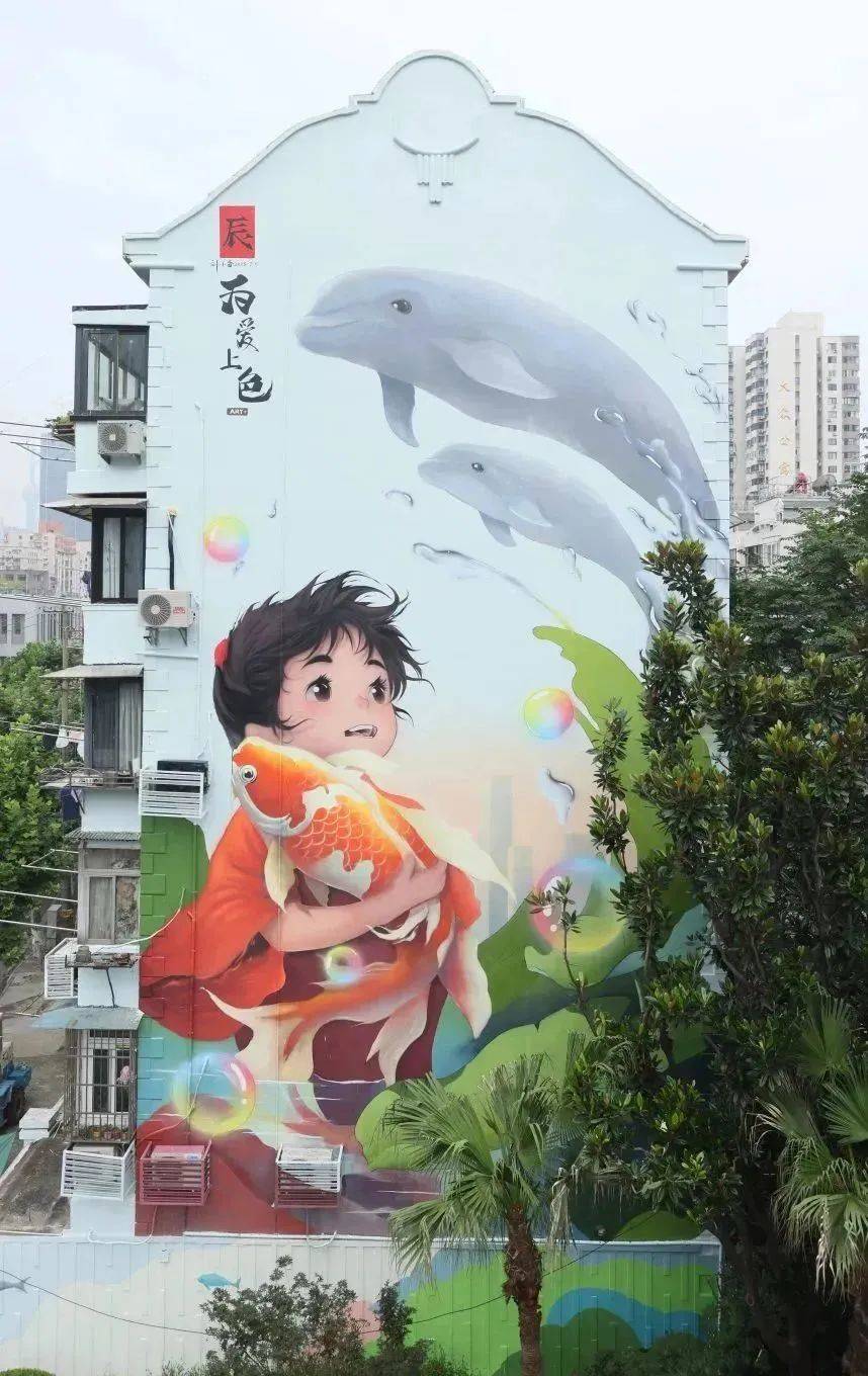 95后墙绘师刘小备的作品《憧憬》亮相北外滩,在高达15米的墙绘作品中,眼神清澈而纯真的孩子手抱锦鲤,传递出美好的祝愿,高高跃起的江豚、充满自然气息的水面绿植和远方城市的轮廓遥相呼应,展示了城市发展与优良生态的相融共生。