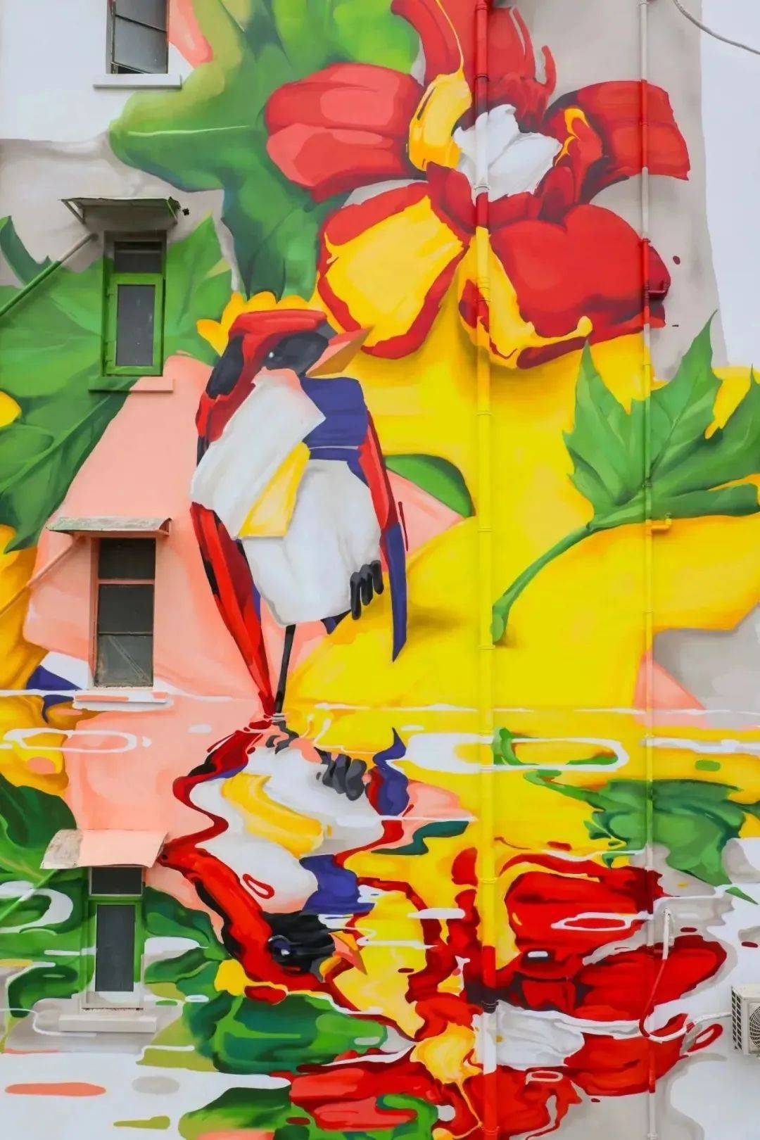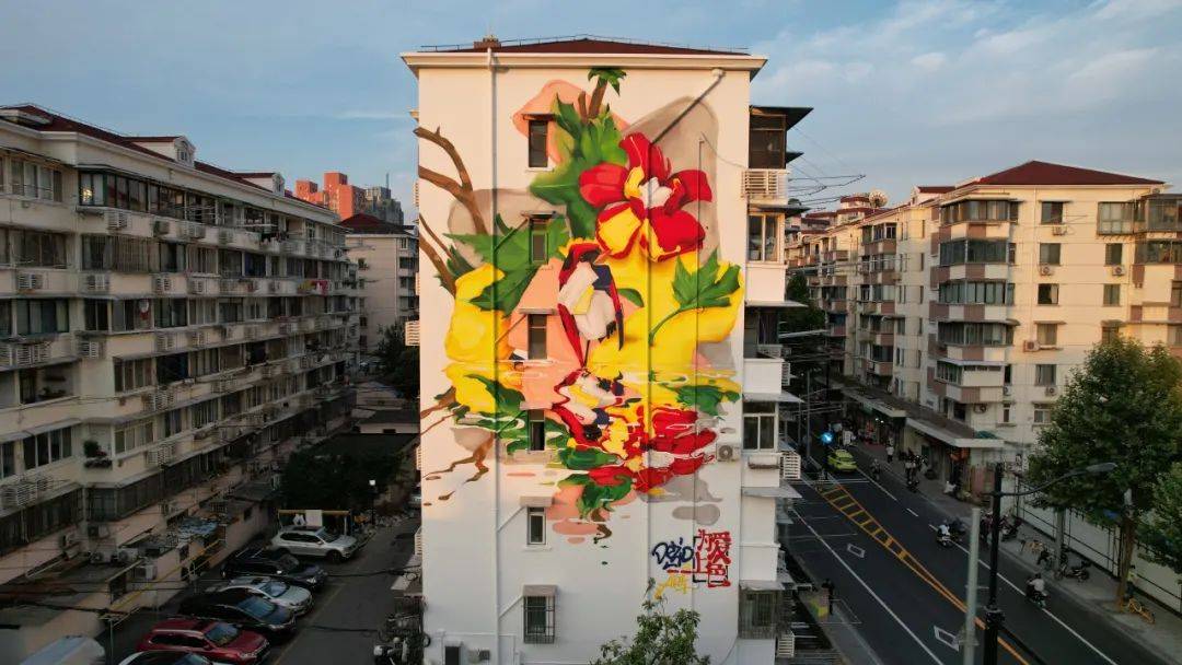 法国涂鸦艺术家DEZIO为长宁区万华小区创作《青春之花》,将不远处中山公园的梧桐树、花卉和苏州河纳入其中,并以一只小鸟站在河边看着自己和周围风景的倒影,寓意充满好奇心的孩童,提醒人们为儿童创造良好的成长环境。