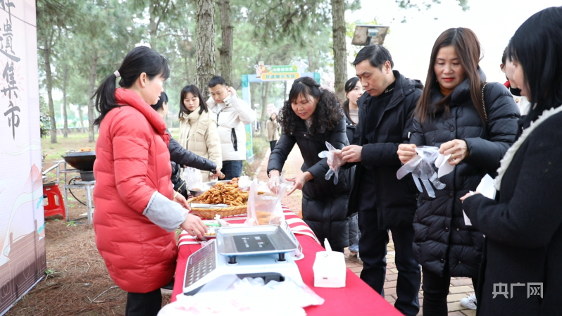另一头的松林驿站广场上,特色农产品展销活动正在火热进行中,竹海午时茶、红薯粉皮、刮皮等一系列土特产品和现场制作的糖粑粒、新市圆子等特色美食,让游客们在踏青赏春的同时,还能一饱口福。