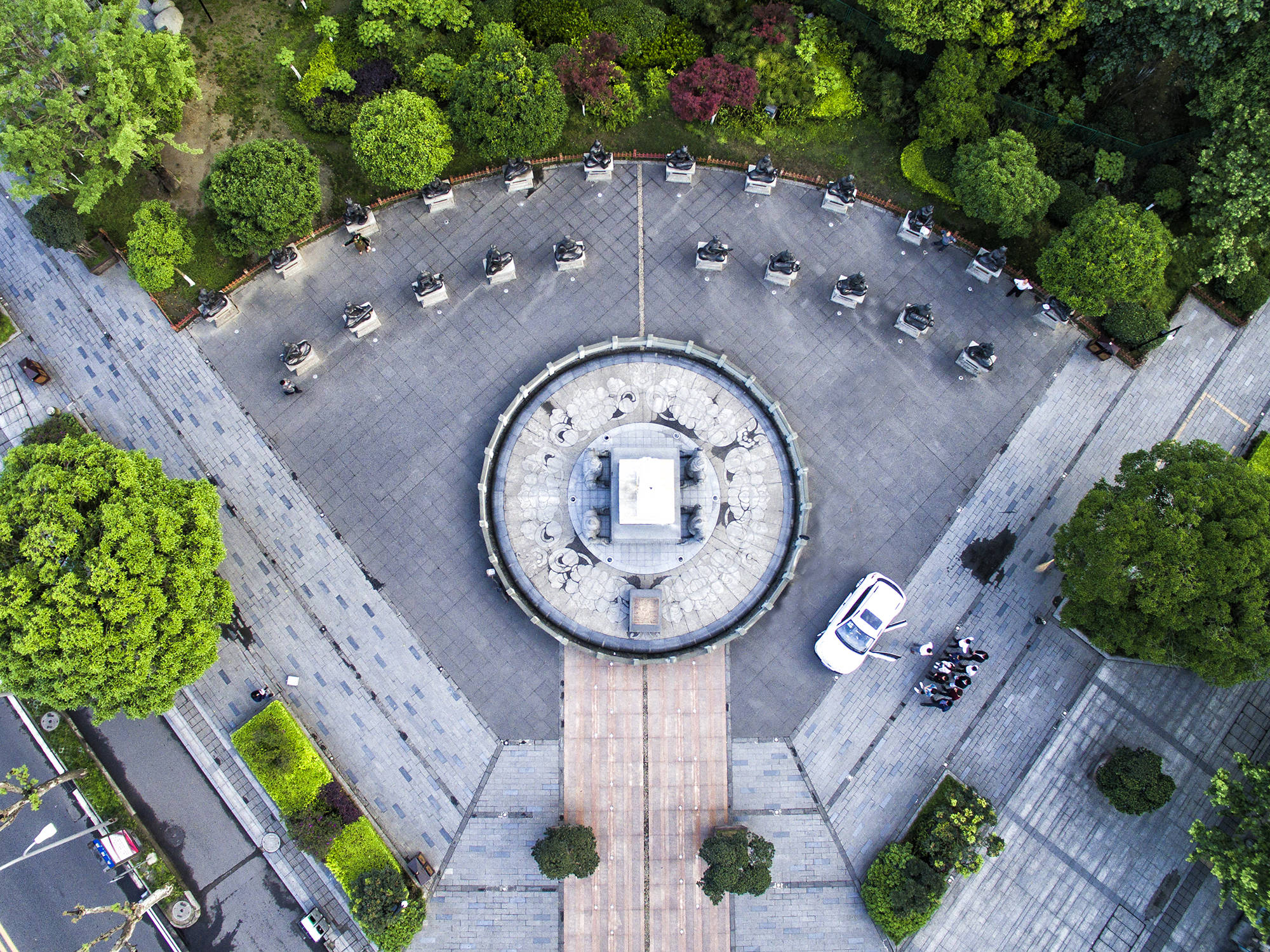 来到永陵的大门口,首先看到的不是博物馆入口,而是是“谥宝广场”,这广场上的雕塑,都是永陵地宫的放大版。广场的中心是一个半圆的平台,四个青石雕刻的勇士双手端着棺床,相貌与今天巴蜀的壮汉相仿,青石雕的棺床上是汉白玉的谥宝,兔首龙身,雕刻这位前蜀皇帝的生肖属相。