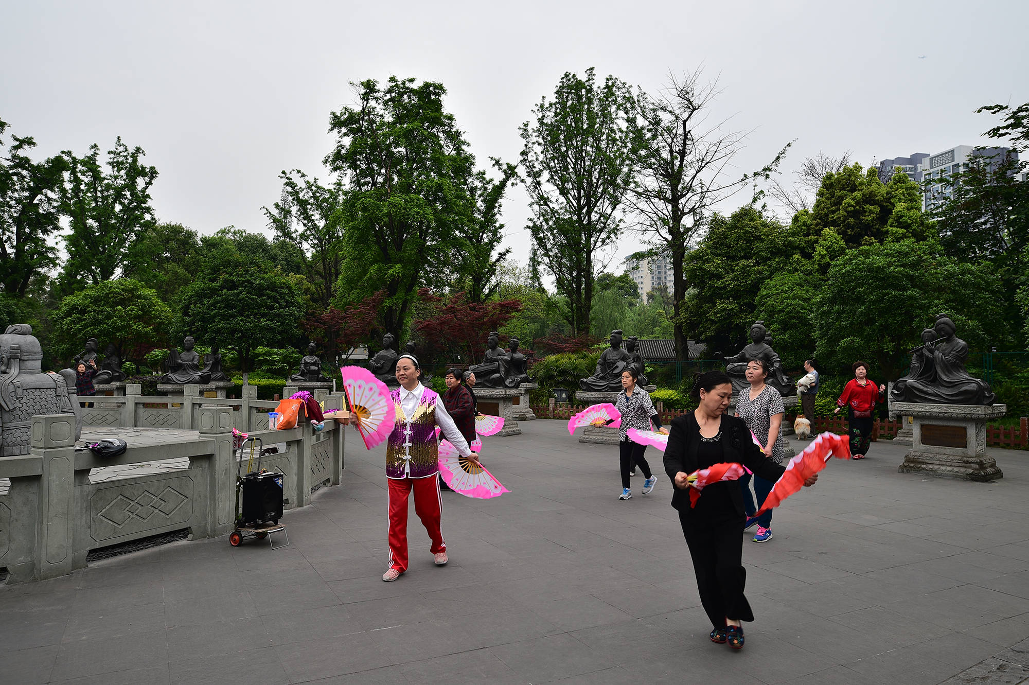 广场后面是二十二乐伎俑铜雕像,具有盛唐风韵。这些雕塑是永陵棺床石雕像的放大像。每个都独立的放在,雕刻得很好的花岗岩石座上,并在石座的背后刻着各自对应的名称和说明。