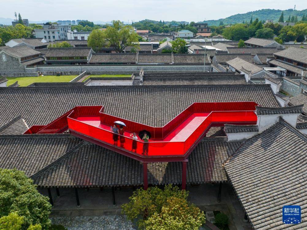7月9日,游客在宁波慈城古县城内的周信芳戏剧艺术馆参观(无人机照片)。
