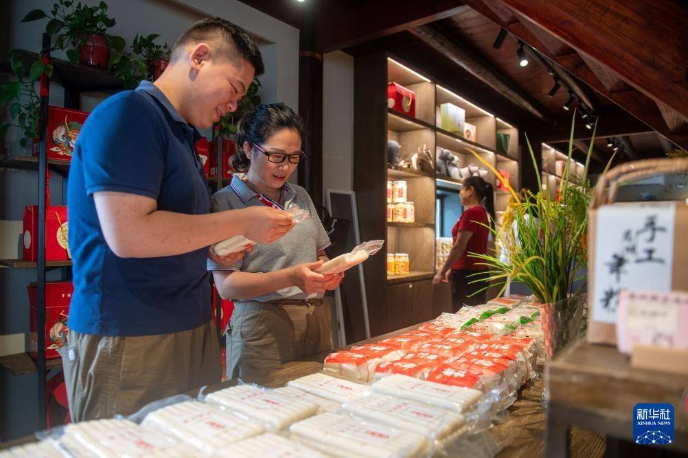 7月9日,游客在宁波慈城古县城商店内挑选年糕产品。年糕是慈城的特产。