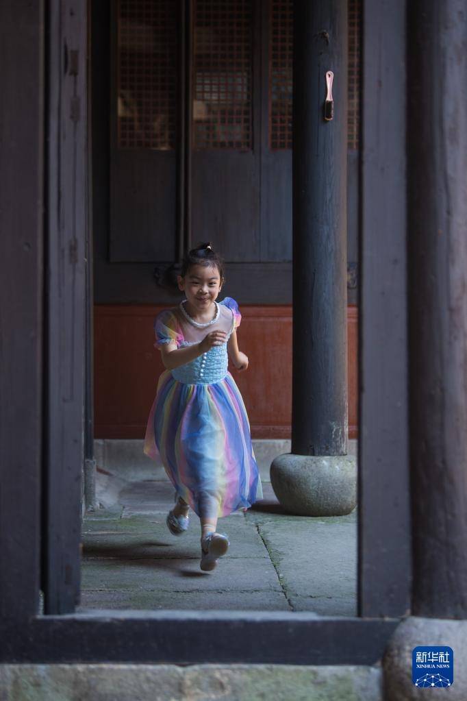 7月10日,邱芮伊在宁波慈城古县城奶奶居住的老屋内玩耍。