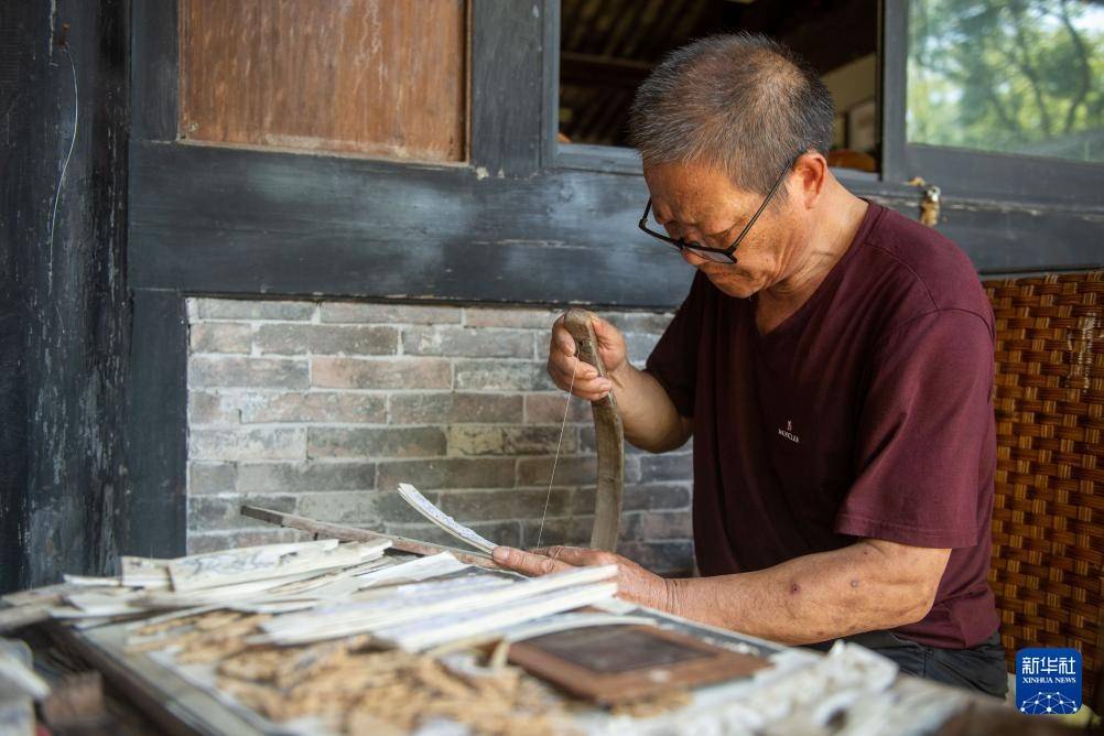 7月10日,骨木镶嵌技艺代表性传承人甘金云在慈城古县城的家中制作骨木镶嵌工艺品。