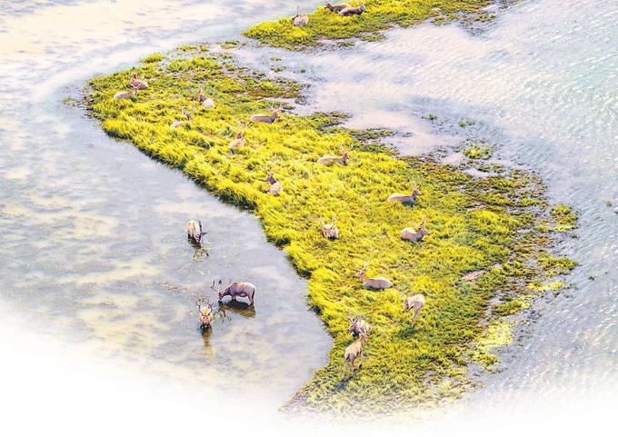 在盐城市大丰区的黄海野鹿荡,成群的麋鹿在滩涂湿地嬉戏、觅食。 周社根 摄 (视觉江苏网供图)