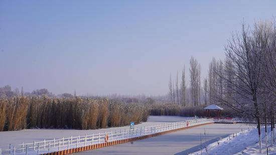 雪后的吉木萨尔北庭国家湿地公园,水面初凝,薄冰似镜,几只赤麻鸭、绿头鸭在水中悠然畅游。芦苇、树木更是被层层雾凇包裹,在阳光照耀下,如玉树琼花闪耀着洁白的光芒。微风吹过,树枝摇曳,簌簌作响,俨然一副生态良好的冬日美丽画卷。