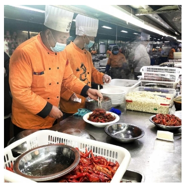 在潜江市生态龙虾城的一家餐饮店,厨师将烹饪好的龙虾装盘
