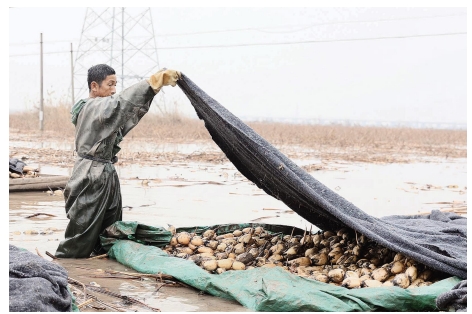 在洪湖市新滩镇莲藕示范基地,莲藕喜获丰收