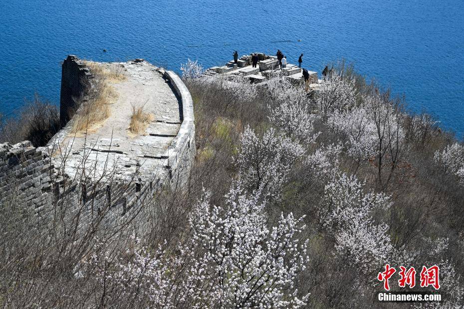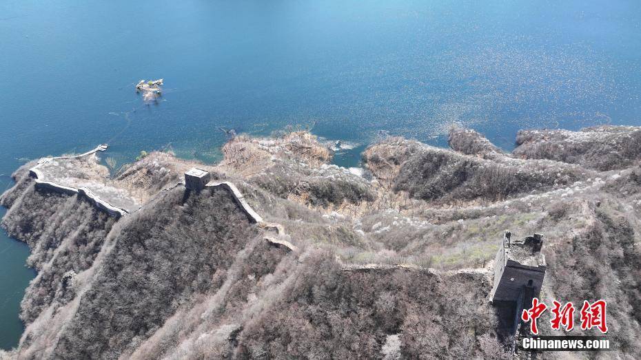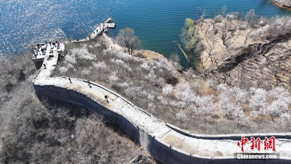 春日暖阳下,河北省宽城满族自治县境内喜峰口“水下长城”两侧的杏花竞相绽放,粉白花瓣缀满枝头。蜿蜒的长城在潘家口水库碧波中时隐时现,游客或乘快艇穿梭于山水间,或登临长城俯瞰花海,镜头定格处,古老的长城与娇嫩杏花交相辉映,构成别样景致。图为4月2日,游客登临河北宽城喜峰口长城赏花游玩。(无人机照片)王立群 摄(来源:中国新闻网)