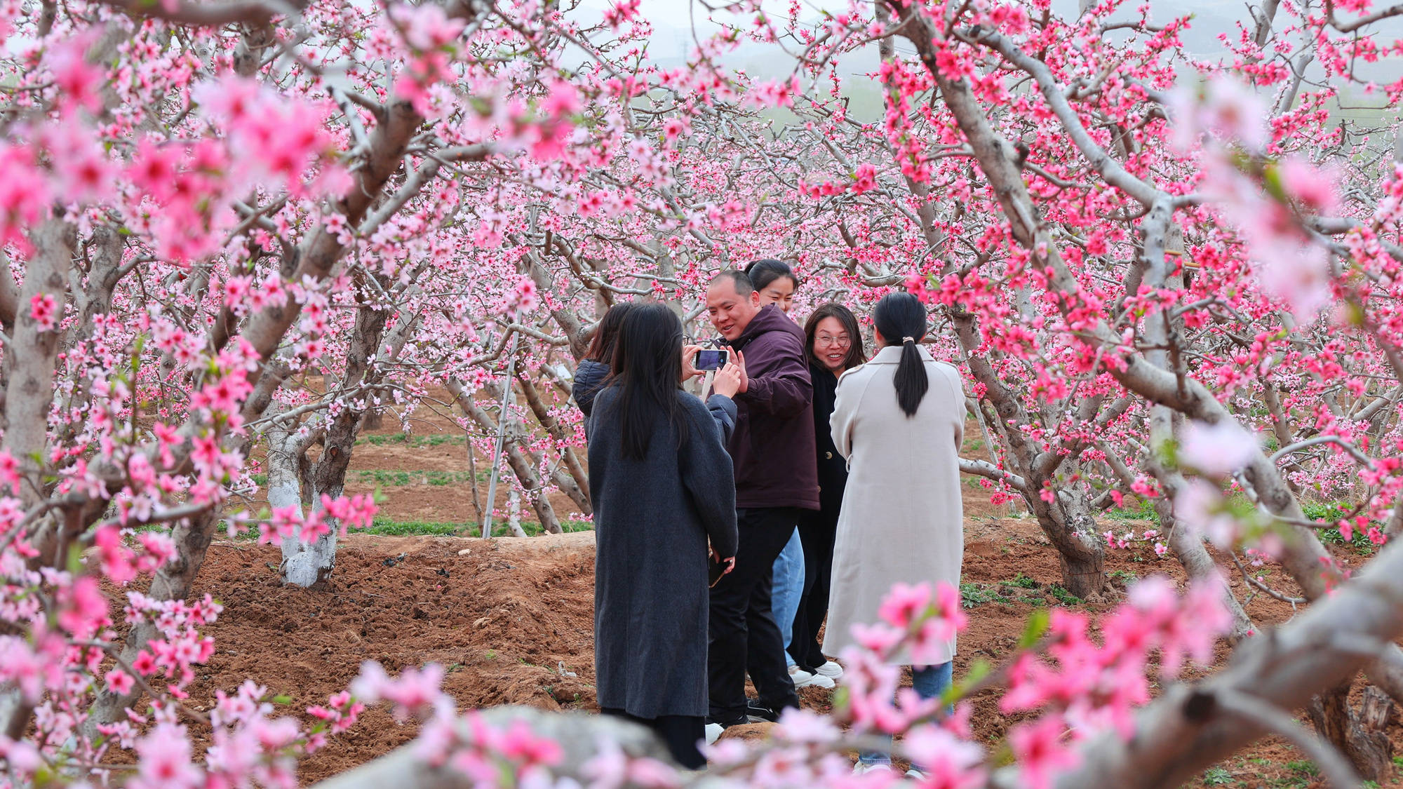 游客在桃花林里打卡拍照(赵端 摄)