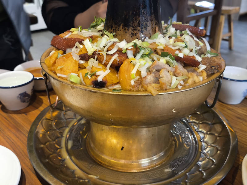 位于平遥古城南大街112号,他家的“旱火锅”是招牌必点!和平时吃的川渝红油火锅完全不一样,吃得边吃边涮的火锅,而是先把食材都放在铜锅里,食材也很丰富,有烧肉、丸子、酥肉、豆腐、白菜、宽粉、海带等层层堆积,汤底是可以喝的高汤,味道正宗,还有自制蘸料可以蘸着吃~除了铜火锅,还有烤串、炒菜、面食可以点。