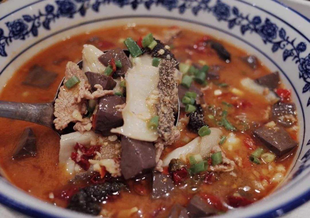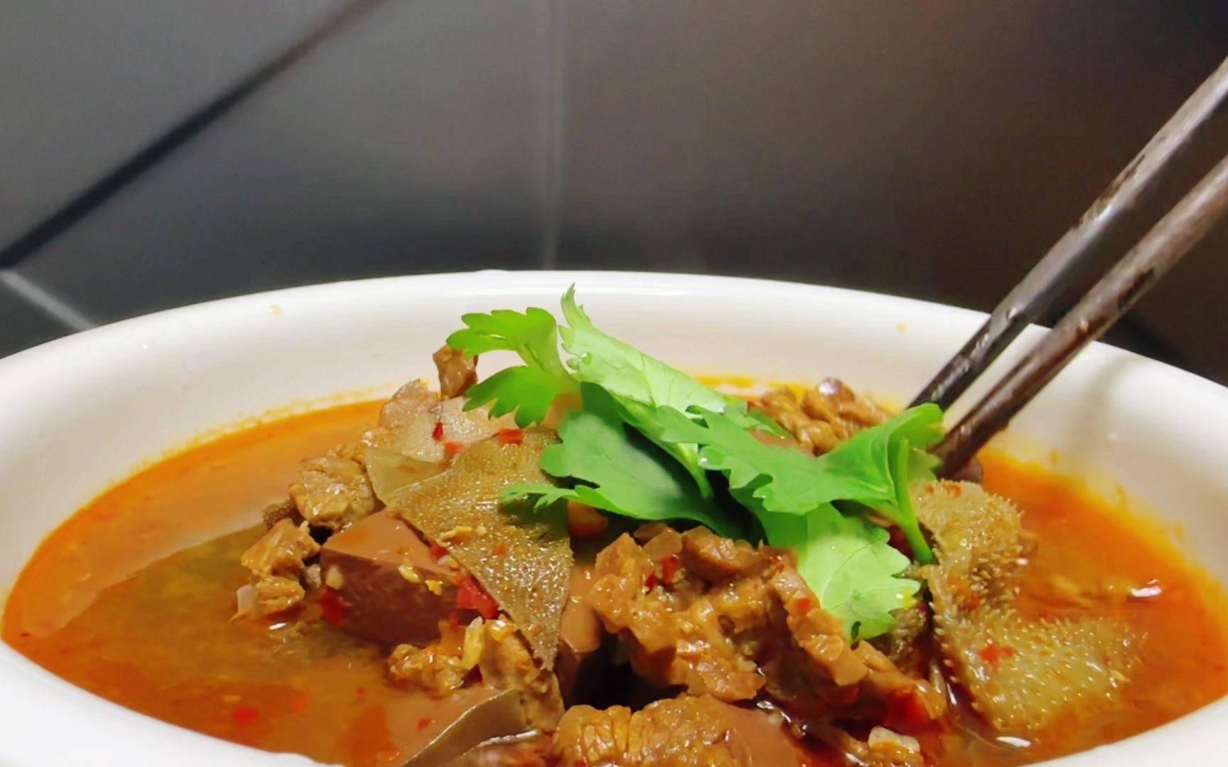 新鲜牛肉、牛肚洗净后切成薄片,再与切成条状的牛血一起下锅内煮熟,吃起来又脆又嫩,牛肚吃着有嚼劲,喝上一口汤鲜香麻辣香。