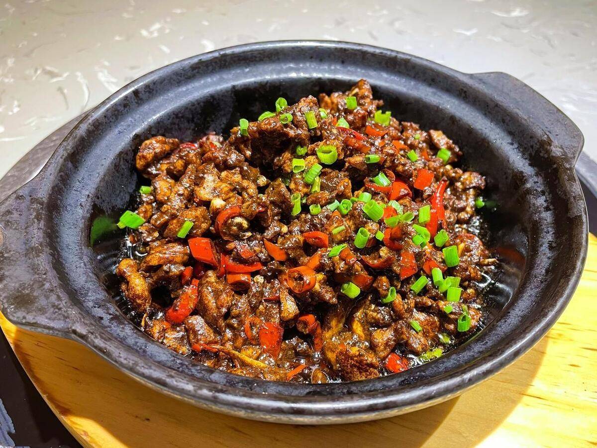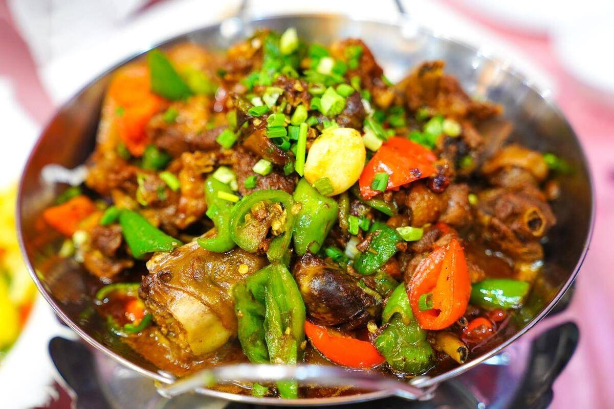 同时,还会加上青红辣椒、姜蒜、辣椒等佐料,炒制后的鸭肉,肉质紧实,色香味俱全。
