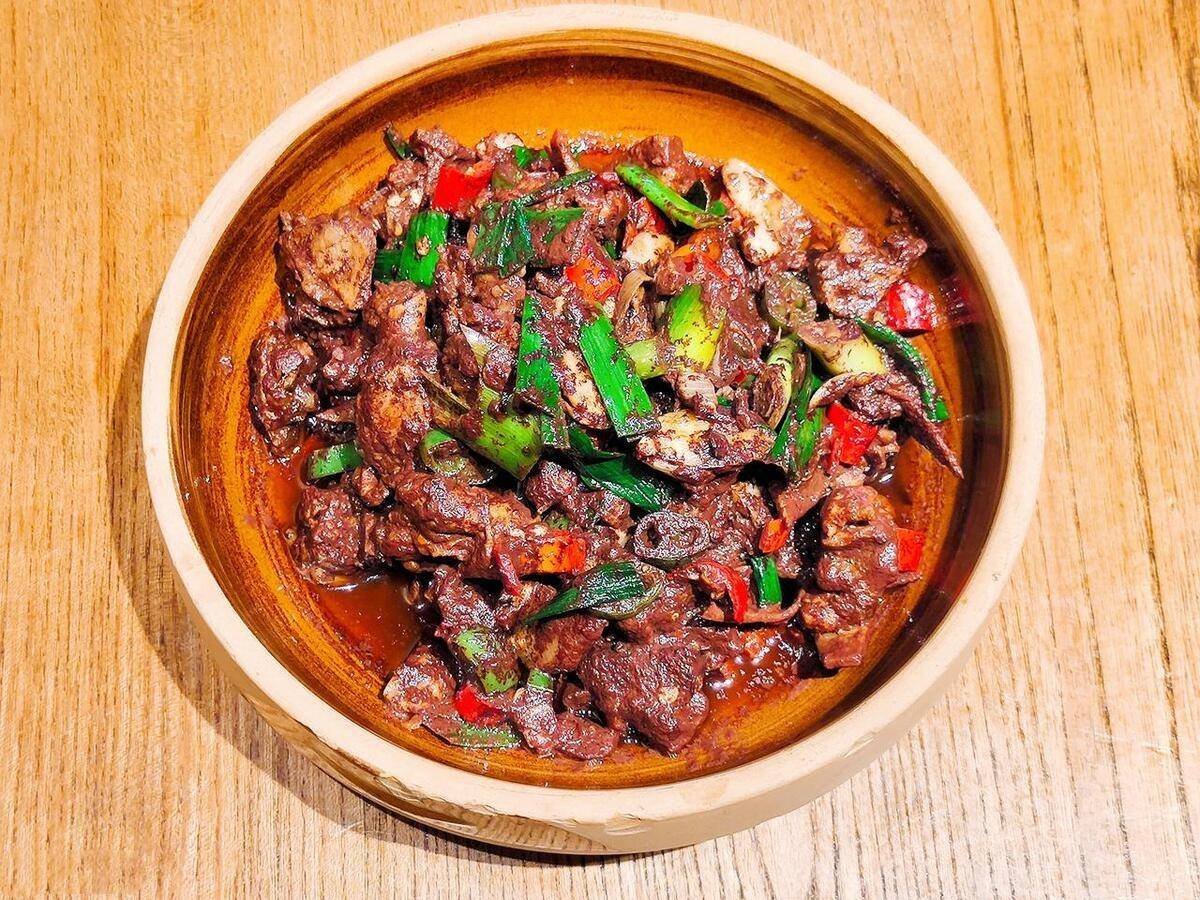 它用的是肥瘦刚好的本地麻鸭,烹饪手法独特,先在新鲜的鸭血里倒入本地醋,防止鸭血凝固,然后直接淋在鸭肉上面,边淋边炒,使鸭块粘在鸭血上。