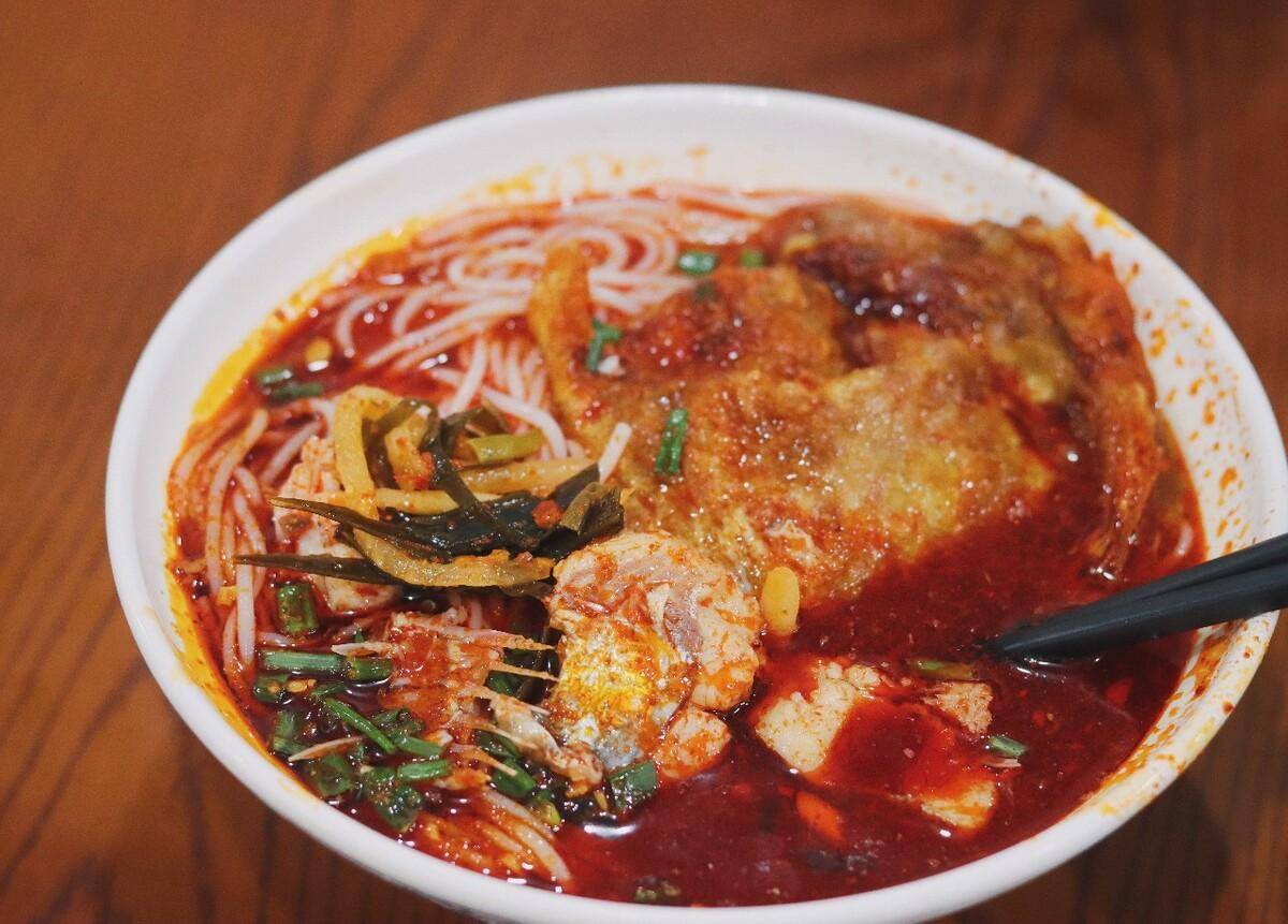 传统的栖凤渡鱼粉,粉用的是栖凤渡本地的优质干切粉,汤是用鲜活鲢鱼熬制而成。尤其是以鲜辣出名的红汤,大块鱼肉浸在红油汤里,又鲜又辣,再加上一个煎蛋,简直绝配。