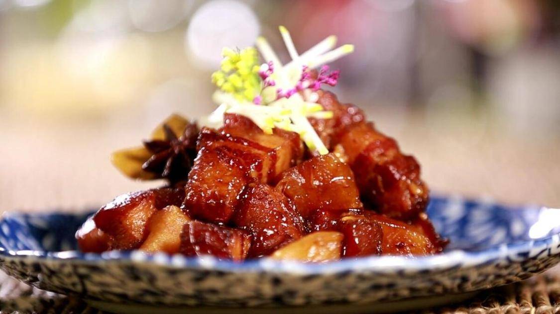 它选用肥瘦相间的五花肉,先将肉切成大小均匀的方块,然后用开水焯去血水,再用冰糖炒出糖色,将肉块放入锅中翻炒上色,加入适量的酱油、料酒、八角等调料,小火慢炖至肉质软烂。吃起来肥而不腻,肉质酥软。