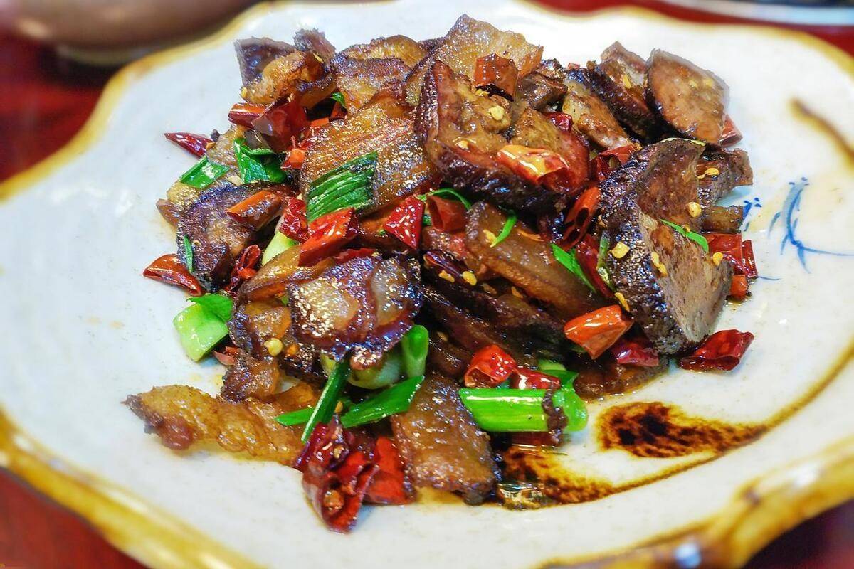 古城内的饭馆多将腊肉与香干混合爆炒,一勺剁青椒、一勺剁红椒、一把干辣椒,再加入萝卜条和莴笋,又香又辣,特别下饭。