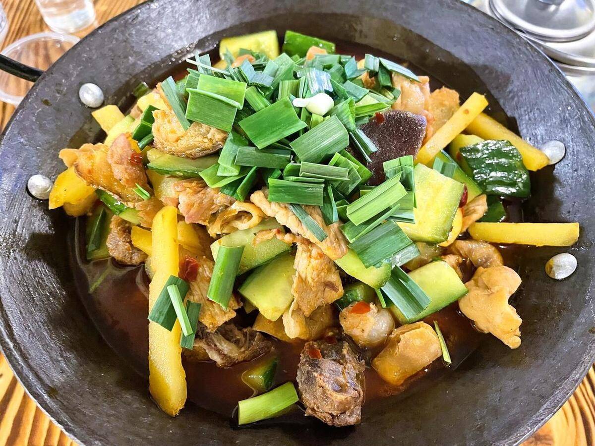 干锅无汤,类似麻辣香锅,更辣香味重,不能吃辣的人最好提前告知老板少辣。