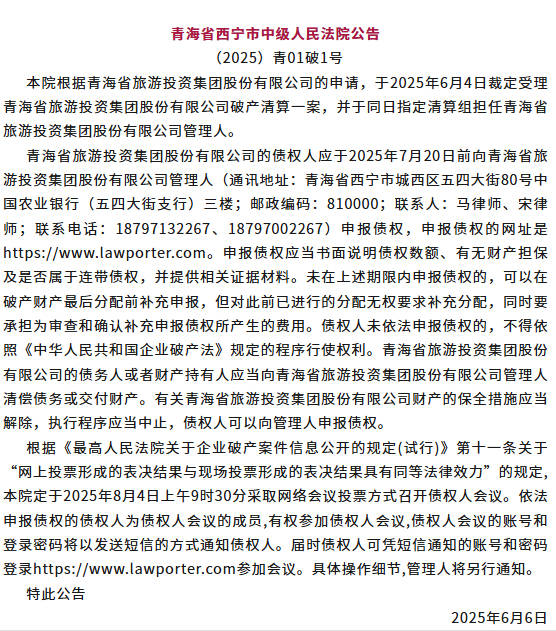 目前,青海旅投及其13家子公司已进入破产清算程序,法院要求相关债权人在2025年7月20日前向管理人申报债权,并定于8月4日上午9点30分采取网络会议投票方式召开债权人会议。
