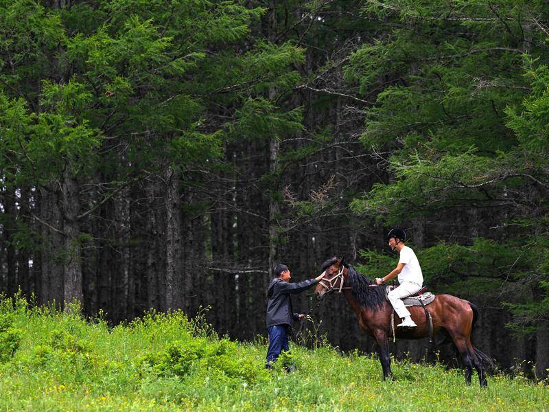 游客在内蒙古阿尔山国家森林公园体验骑马。新华社记者 贝赫 摄