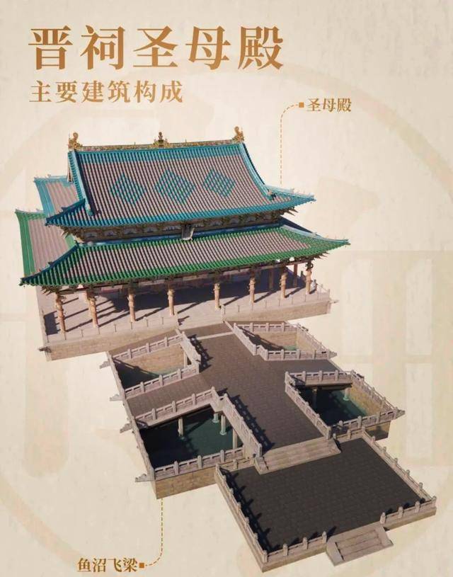 - 圣母殿:晋祠的主殿,建于北宋太平兴国九年,是我国现存古代建筑中唯一符合《营造法式》殿堂式构架形式的孤例,殿前檐柱上八条盘龙木雕,是宋时期古建筑中仅存实例。