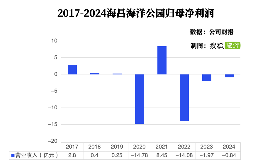 无独有偶,海洋主题公园运营商“一哥”海昌海洋公园也面临业绩下滑、负债高企的局面。财报显示,去年入园人次同期增长16%,净亏损却扩大至7.5亿元, 2020年至2024年期间,海昌公园仅2021年录得盈利,五年时间累计亏损超29亿元,财务状况岌岌可危。